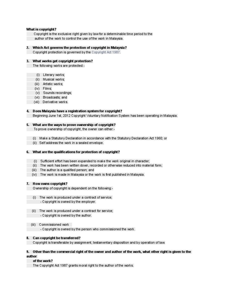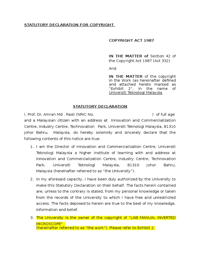 Copyright protection in malaysia is governed by the copyright act 1987 which provides comprehensive protection for copyrightable works. The malaysian copyright act of 1987 defines copyright in relation to a musical work as being the exclusive right to (5) commercially rent a work to the public. Malaysia is a signatory of the berne convention and therefore, copyrighted work created in malaysia would be recognized by each contracting member country of the berne convention. The facts deposed to herein are to the best of my knowledge and belief true and are within my personal knowledge and/or from records. Akta hakcipta 1987 by malaysia., 1987, international law book services edition, in multiple languages.