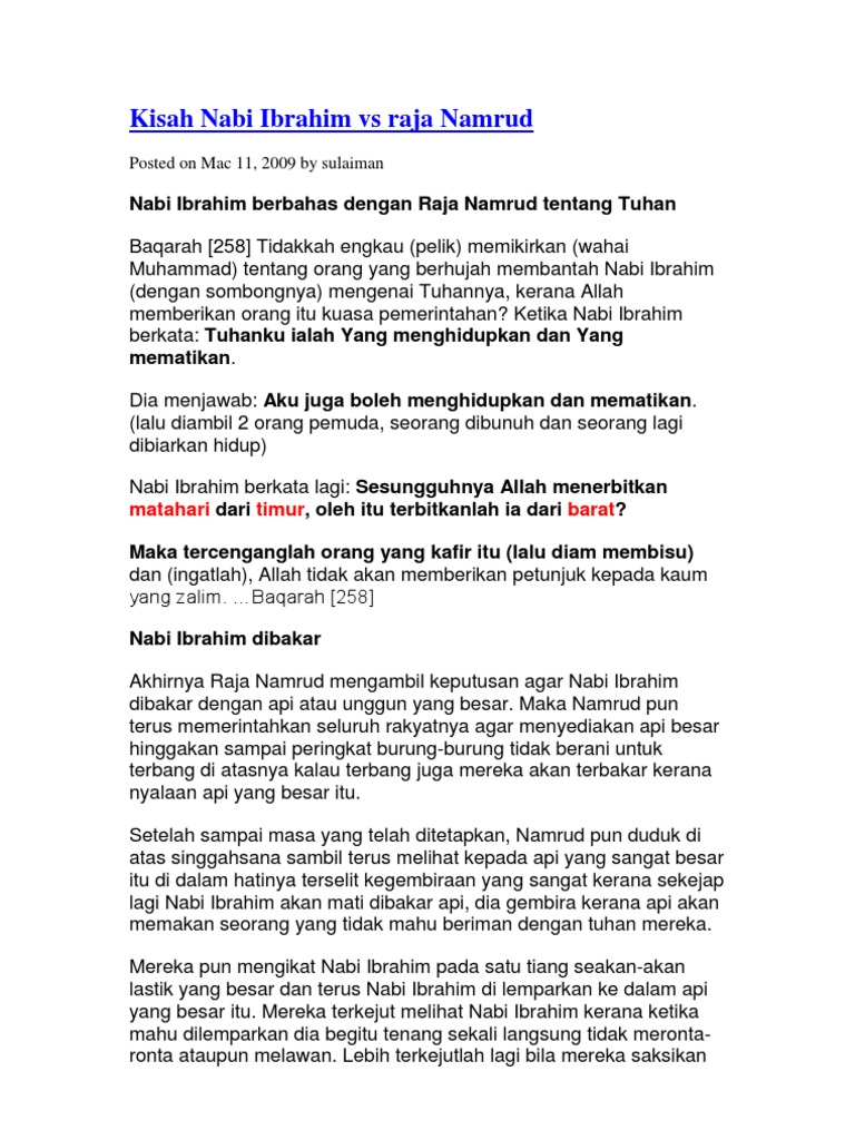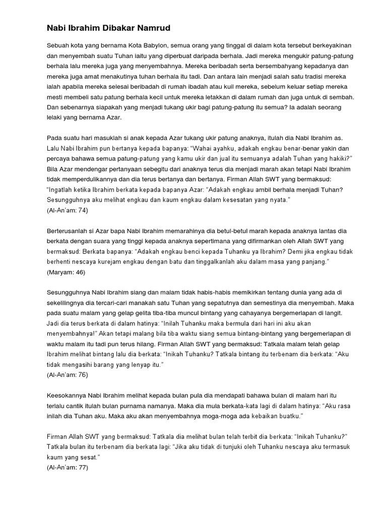 Page 105 Ayo Mengaji 4 from ebook.banyuwangikab.go.id Secara silsilah, nabi ibrahim adalah ibrahim nabi ibrahim dilahirkan pada tahun 2295 sm di negeri mausul. Kisah nabi ibrahim as memiliki banyak pesan nilai moral dan kehidupan. Kisah nabi ibrahim dibakar akan menjadi pembahasan dalam video yang disampaikan oleh ustadz m abduh tuasikal diatas. Nabi ibrahim dicari dan dibakar. Nabi ibrahim ketika dibakar dg api ternyata api itu tidak mampu membakarnya dan inilah mukjizat nabi ibrahim yg ia dapatkan dr. Dari peristiwa dibakarnya nabi ibrahim tersebut ternyata nabi ibrahim tetap hidup sebab mukjizat yang allah turunkan kepada nabi ibrahim tersebut. Nabi ibrahim as lahir di kota ur, wilayah mesopotamia yang sekarang dikenal sebagai negara iraq, sekitar 2000 sm atau 4000 tahun yang lalu. Salah satu cara mendidik anak secara.